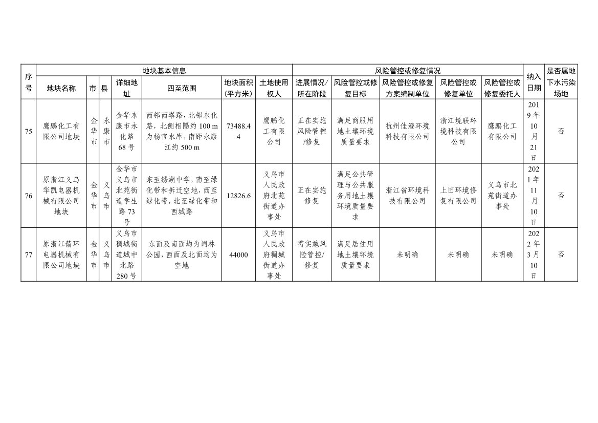 據(jù)悉,4月24日,浙江省生態(tài)環(huán)境廳發(fā)布浙江省建設(shè)用地土壤污染風(fēng)險(xiǎn)管控和修復(fù)名錄(含地下水污染場(chǎng)地)與浙江省建設(shè)用地土壤污染風(fēng)險(xiǎn)管控和修復(fù)名錄移出清單(2022年4月24日更新),詳情如下:
