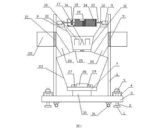這種土壤篩分裝置包括:支撐底座,支撐底座下表面設(shè)置有萬向輪,支撐底座兩端設(shè)置有限位固定件,支撐底座上方設(shè)置有支撐立板,支撐橫板上設(shè)置有滾篩粉碎裝置,滾篩粉碎裝置下方設(shè)置有喇叭狀儲(chǔ)料槽,支撐底座上表面設(shè)置有離心電機(jī),離心電機(jī)上方連接旋轉(zhuǎn)底座,旋轉(zhuǎn)底座上設(shè)置有篩分箱體,篩分箱體頂部與喇叭狀儲(chǔ)料槽之間設(shè)置有分流裝置,篩分箱體頂部兩端設(shè)置有一級(jí)出料管和二級(jí)出料管,一級(jí)出料管和二級(jí)出料管對(duì)應(yīng)的支撐立板上設(shè)置有一級(jí)篩分網(wǎng)和二級(jí)篩分網(wǎng),一級(jí)出料管和二級(jí)出料管分別連接存料倉。該裝置通過支撐底座的萬向輪方便裝置進(jìn)行位置移動(dòng),移動(dòng)到指定位置時(shí)通過調(diào)節(jié)鎖緊螺栓實(shí)現(xiàn)平穩(wěn)固定。