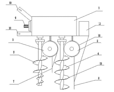 土壤修復(fù)裝置,屬于土壤修復(fù)設(shè)備技術(shù)領(lǐng)域,包括豎向提升機(jī)構(gòu)及與其相連的橫向輸送機(jī)構(gòu),豎向提升機(jī)構(gòu)、橫向輸送機(jī)構(gòu)與動(dòng)力機(jī)構(gòu)傳動(dòng)連接。本發(fā)明的結(jié)構(gòu)簡(jiǎn)單、整體設(shè)計(jì)合理、操作方便且土壤修復(fù)效果好。