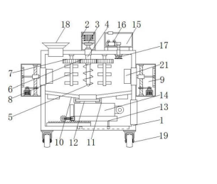 土壤修復(fù)釜,包括箱體,箱體的頂部固定連接有電機箱,且電機箱的頂部固定連接有第一電機,第一電機的輸出軸通過聯(lián)軸器固定連接有旋轉(zhuǎn)軸,旋轉(zhuǎn)軸的底端依次貫穿電機箱的底部和箱體的頂部且延伸至箱體的內(nèi)部,旋轉(zhuǎn)軸位于箱體內(nèi)部的一端固定連接有螺旋桿,旋轉(zhuǎn)軸位于箱體內(nèi)部的表面固定連接有主動齒輪,本發(fā)明涉及