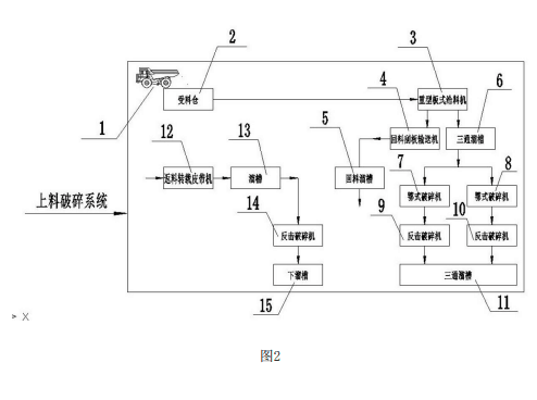 現(xiàn)有的石料生產(chǎn)上料土壤破碎系統(tǒng)一般采用大塊石料經(jīng)料倉由振動給料機送進鄂式 破碎機進行一級粗碎,一級粗碎后的石料由皮帶輸送機送到反擊式破碎機進行進二級細(xì) 碎;經(jīng)過反擊式破碎機細(xì)碎后的石料由皮帶輸送機送進振動篩進行篩分,篩分出幾種不同 粒徑規(guī)格的石子,滿足粒度要求的石子由成品皮帶輸送機送往成品料堆;不滿足粒粒徑要 求的石子由皮帶輸送機返料送到反擊式破碎機進行再次破碎,形成閉路多次循環(huán)?,F(xiàn)有技 術(shù)采用振動給料機作為石料生產(chǎn)系統(tǒng)的原料輸送,因振動給料機給料能力有限,單臺破碎 機處理能力有限,需要設(shè)計多條生產(chǎn)線來滿足產(chǎn)量。造成占地面積較大,且大多為露天生 產(chǎn),不符合環(huán)保要求?,F(xiàn)有技術(shù)使用的反擊式破碎機是二級破碎的設(shè)備,同時又承擔(dān)經(jīng)過篩 分系統(tǒng)分級后不滿足粒徑要求的石子返料的破碎,因通過鄂式破碎機進行粗碎后的石料粒 度組成和經(jīng)過反擊式破碎機細(xì)碎后的再經(jīng)過篩分系統(tǒng)分級后不滿足粒粒徑要求的返料的 石料粒度組成不一樣,通過一級鄂式破碎機破碎過的石料粒徑通常在150~300毫米,通過 二級反擊式破碎機破碎整形后的石料粒徑通常在50~150毫米;且采用技術(shù)參數(shù)相同的反 擊式破碎機不能有效發(fā)揮設(shè)備性能,同時影響生產(chǎn)線的生產(chǎn)能力。